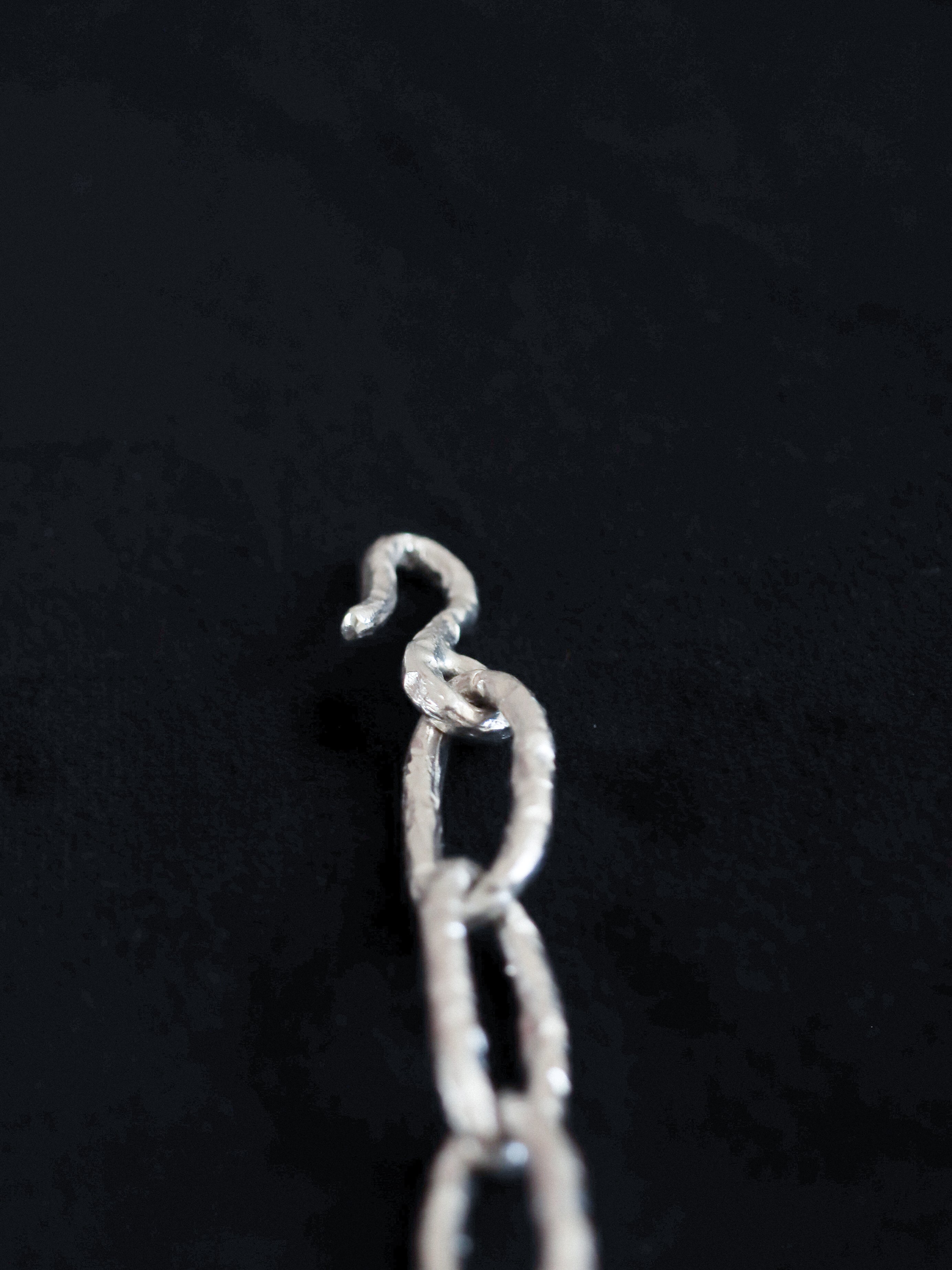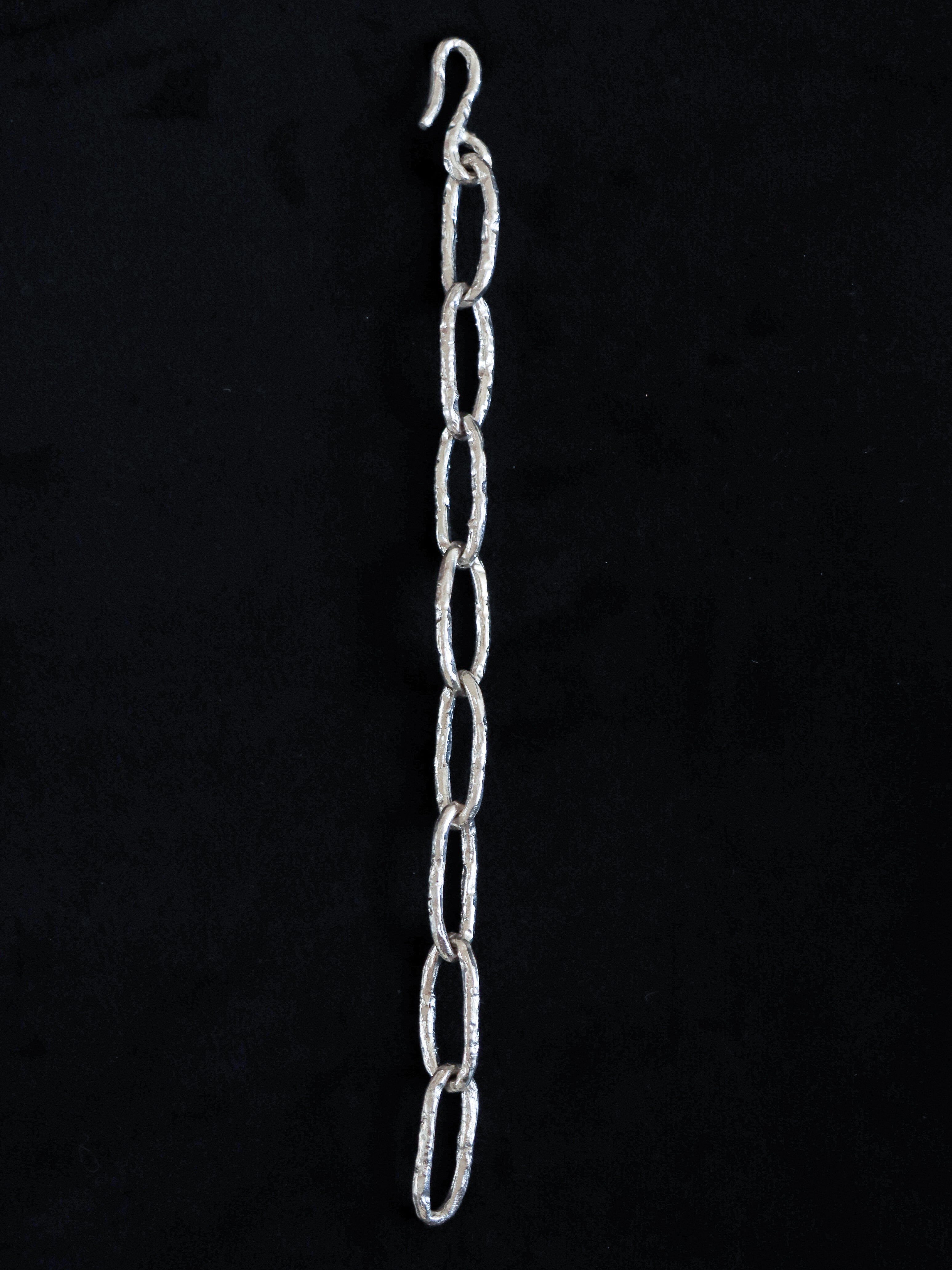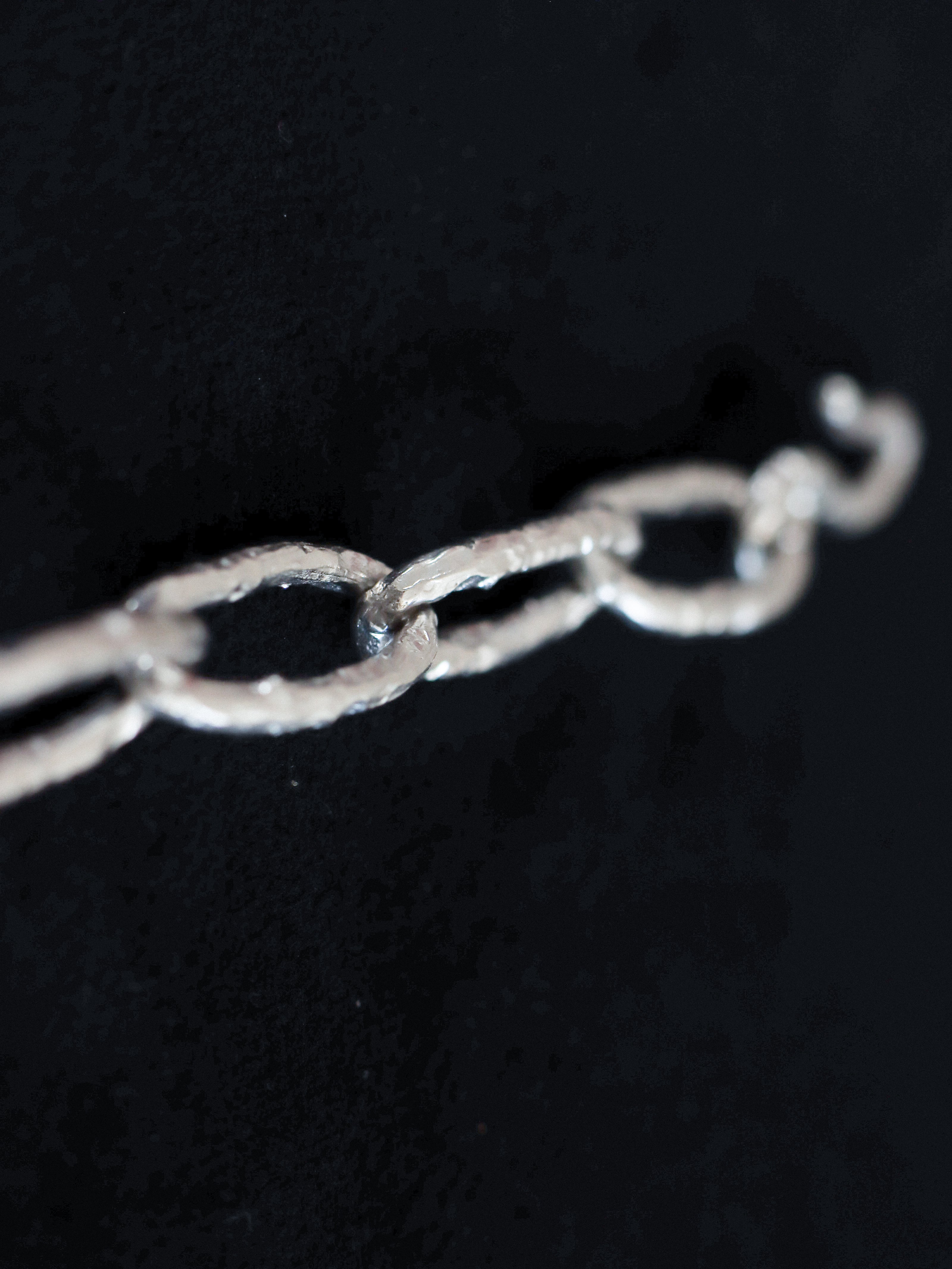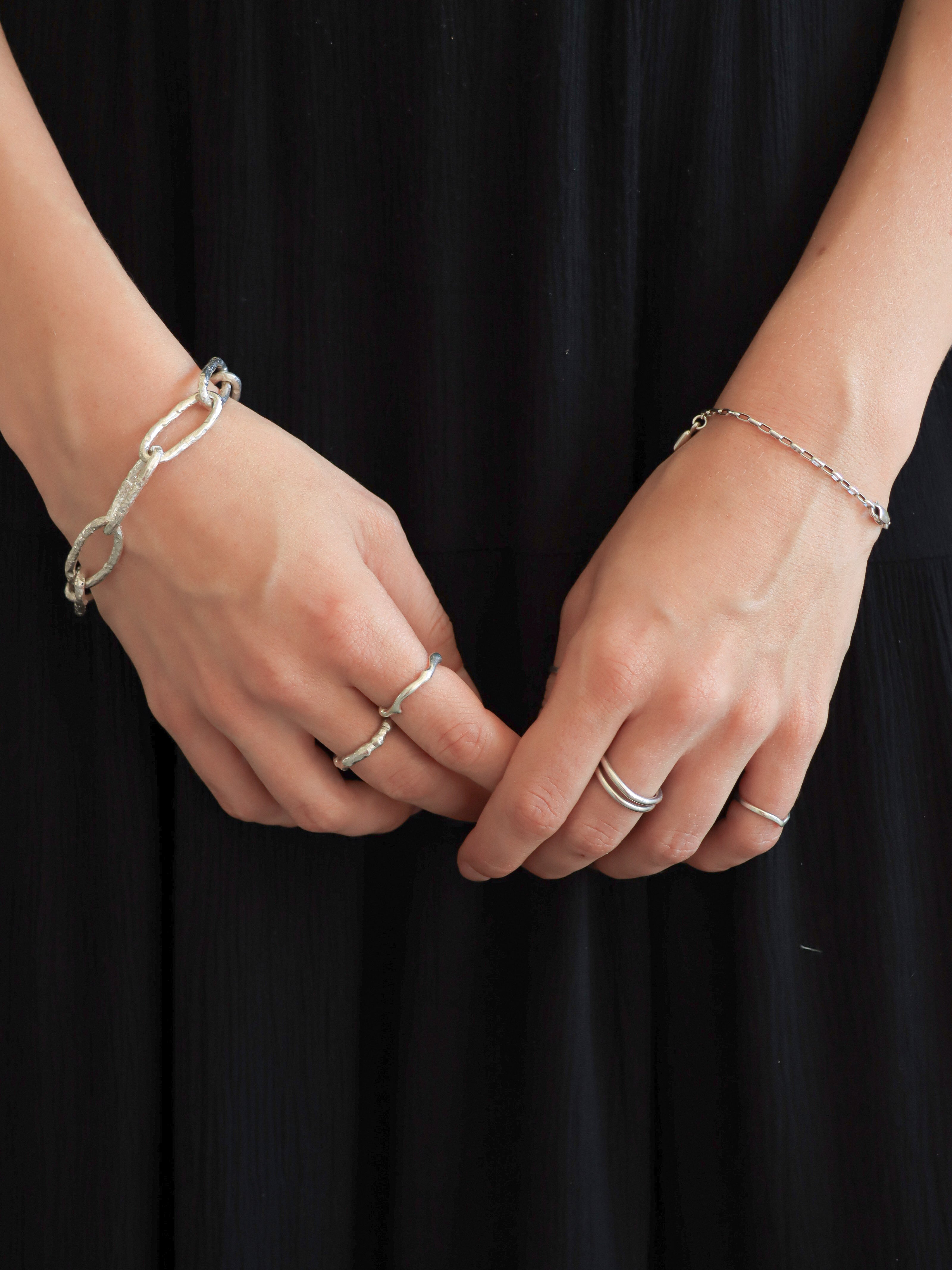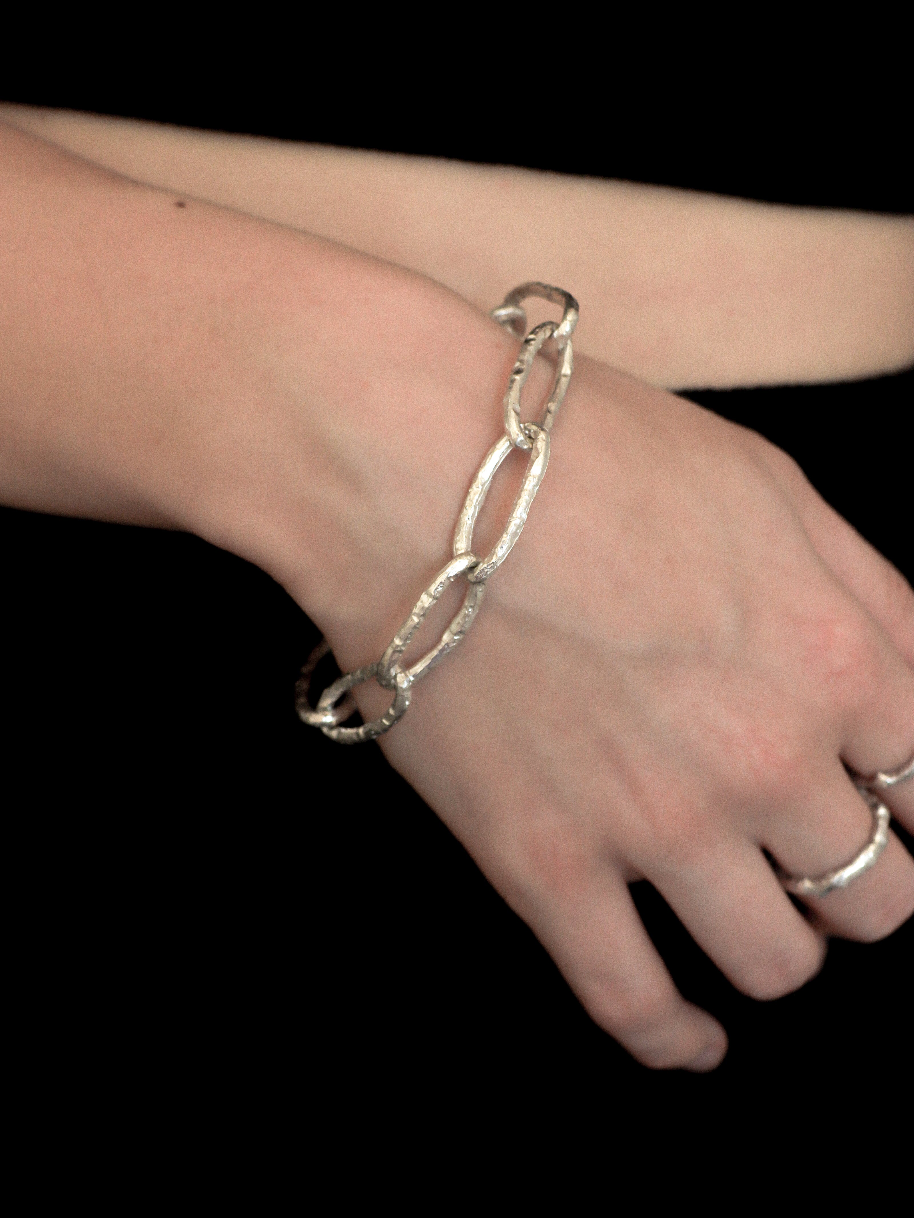 Handcrafted from sterling silver, this bracelet embodies the beauty of pure, raw craftsmanship. Each of its 9 links (including the clasp) is individually shaped, soldered, and finished by hand, giving the piece a distinct, organic texture.