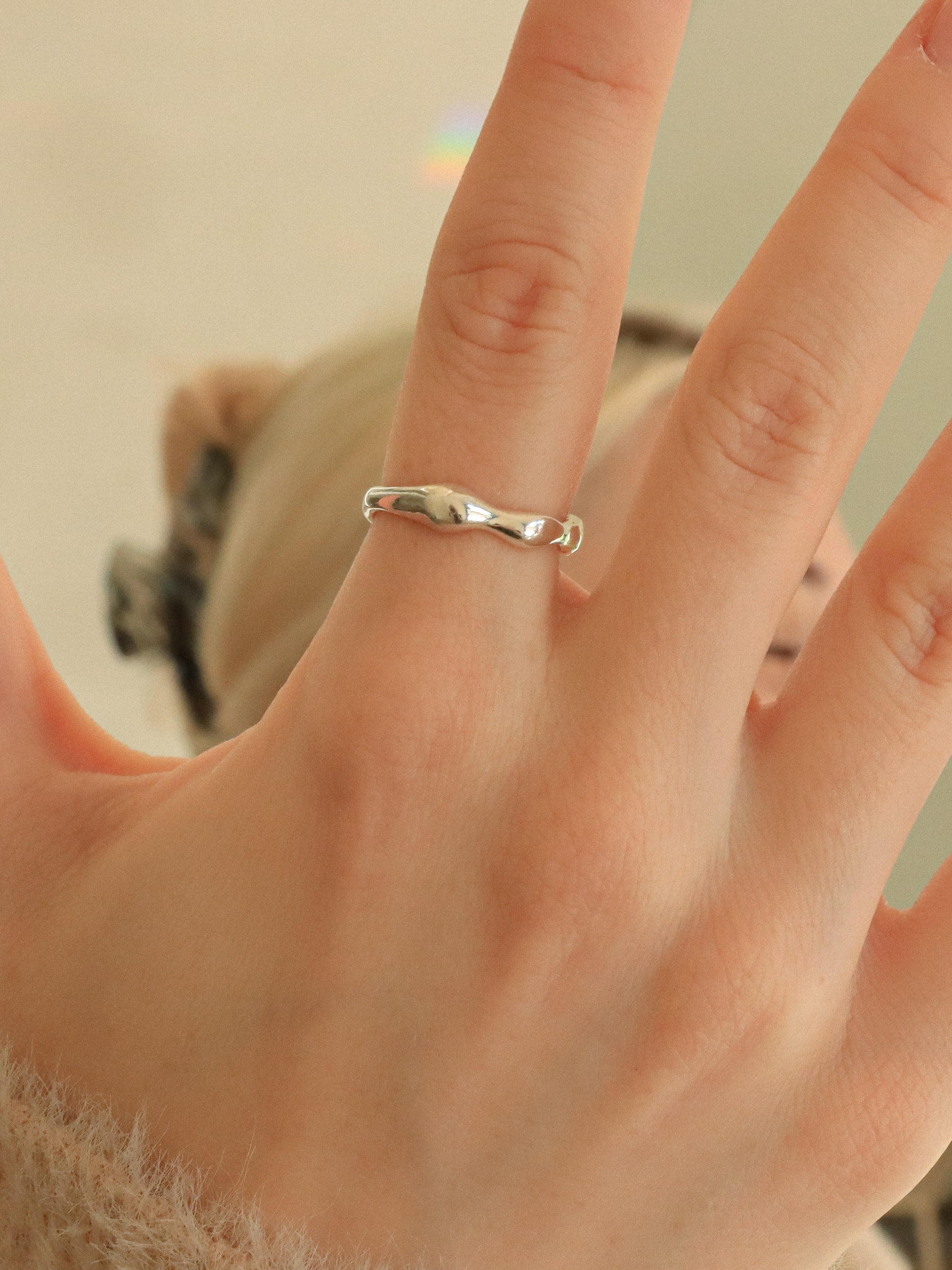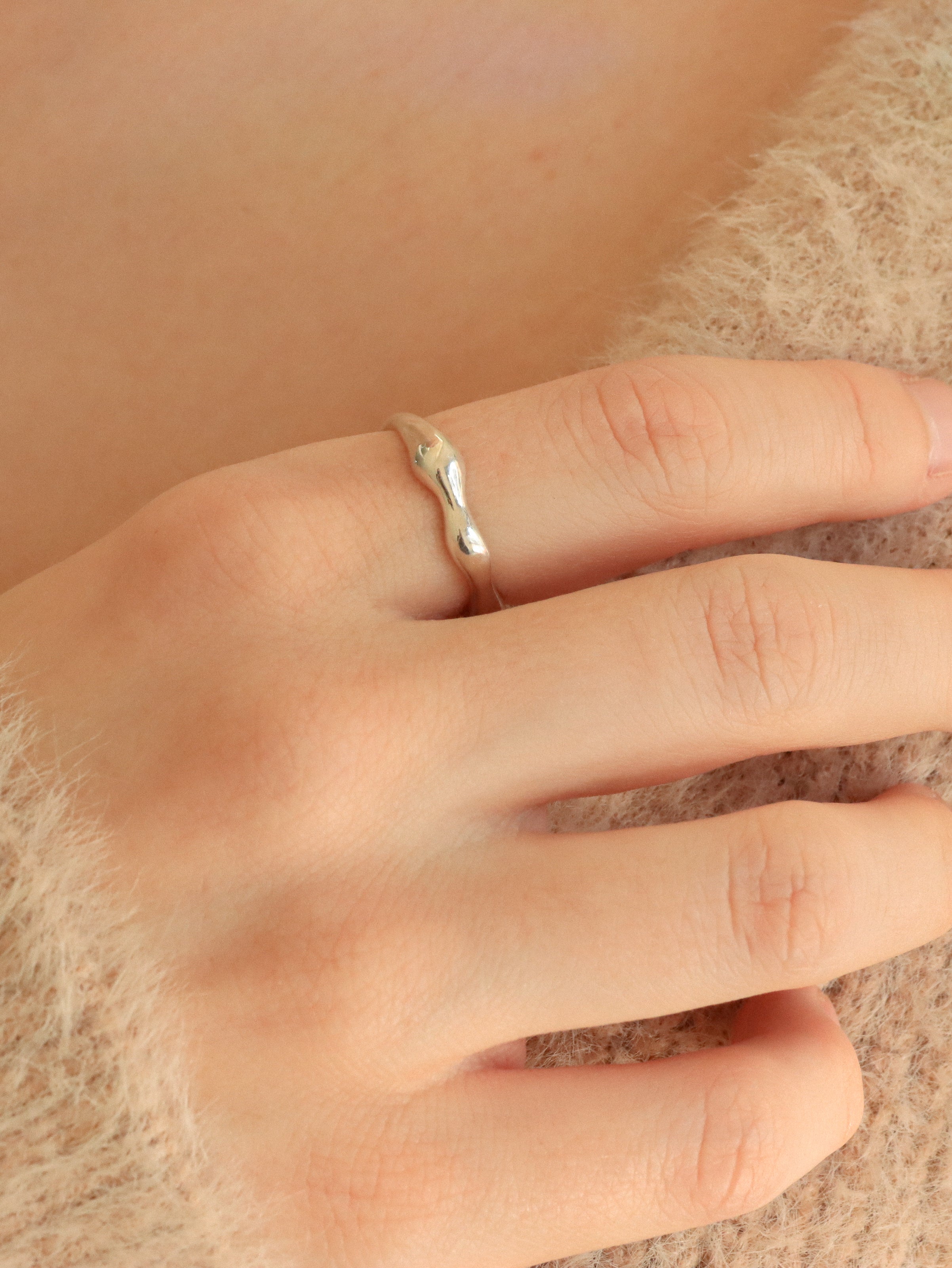 This sterling silver ring features natural, fluid shapes carefully formed by hand, creating a soft and organic silhouette. The glossy surface enhances the flowing lines of the design, reflecting light and emphasizing the purity of the material.